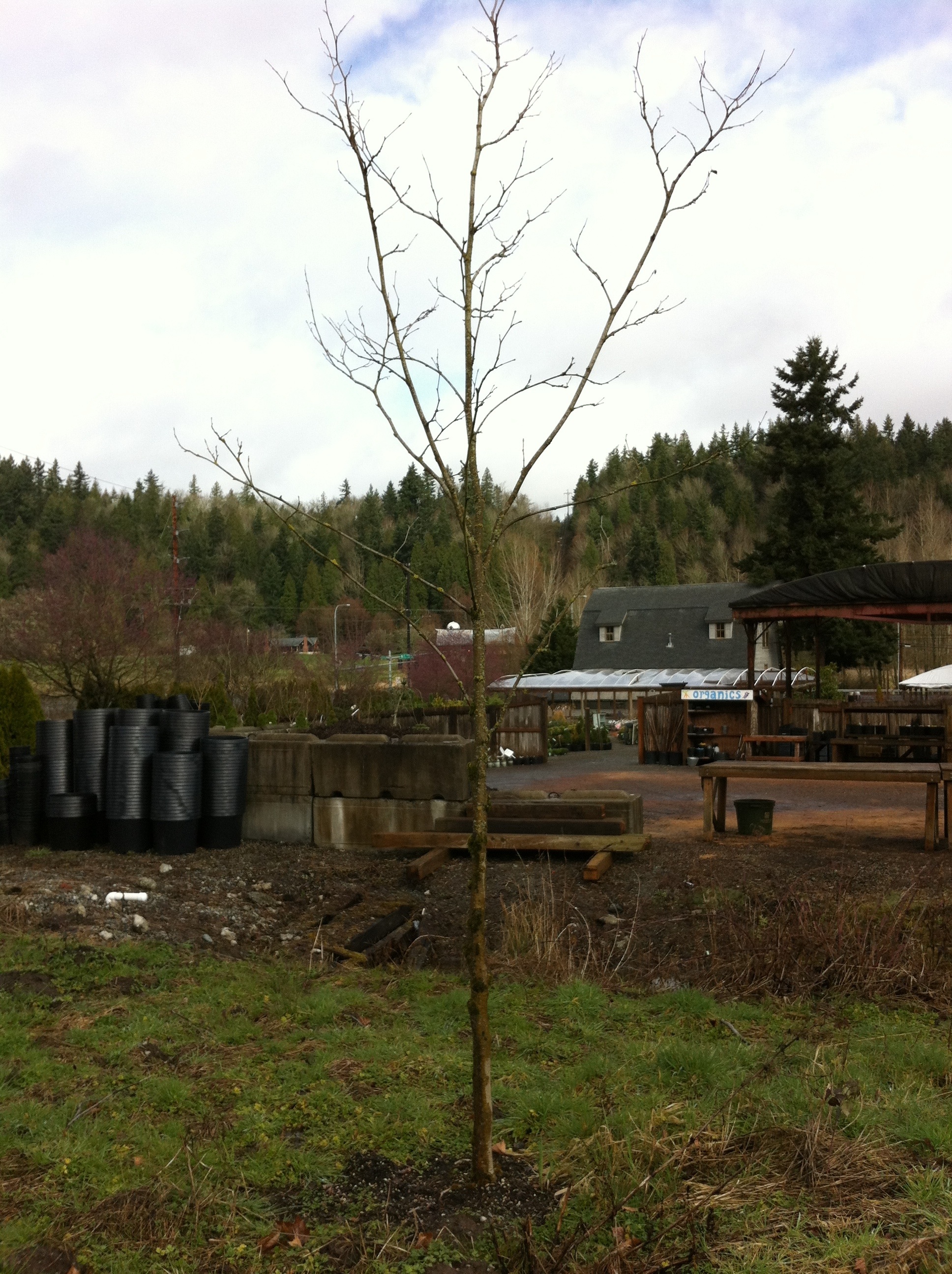 A small celebration is in order.  Today at the nursery we planted a tree,  Platanus acerifolia ‘bloodgood’ the London Plane tree.  A tree that nobody wanted.  It was on sale for many seasons, no one bought it.  It was moved to the 50% off section for a year.  No one cared.  It was a few twigs away from being recycled and turned into compost, but it spoke to us in tree-ish language.  One which we rarely hear and less often understand.  Today we listened and found it a new home.  Out of the old 20 gallon pot it came, root-bound and squeezed.   Into the ground it went, surrounded by enemies; poor soil, weeds and rocks.  We dug the hole wide and tossed in nutrient mulch and good soil to amend the heavy clay.  Luckily this tree is known to tolerate poor soil conditions—welcome to our garden!  Around 12 feet tall, our London Plane tree had that naked winter look.  Unassuming and transparent, yet with a natural grace.  The branches moved upward and outward, and our imaginations did too.  We looked at this minimal, unwanted tree and in our minds saw a sixty foot mature specimen, with maple-like leaves, shading the ground for picnicking and parties.  Meet us under the London Plane tree in thirty years for the celebration!