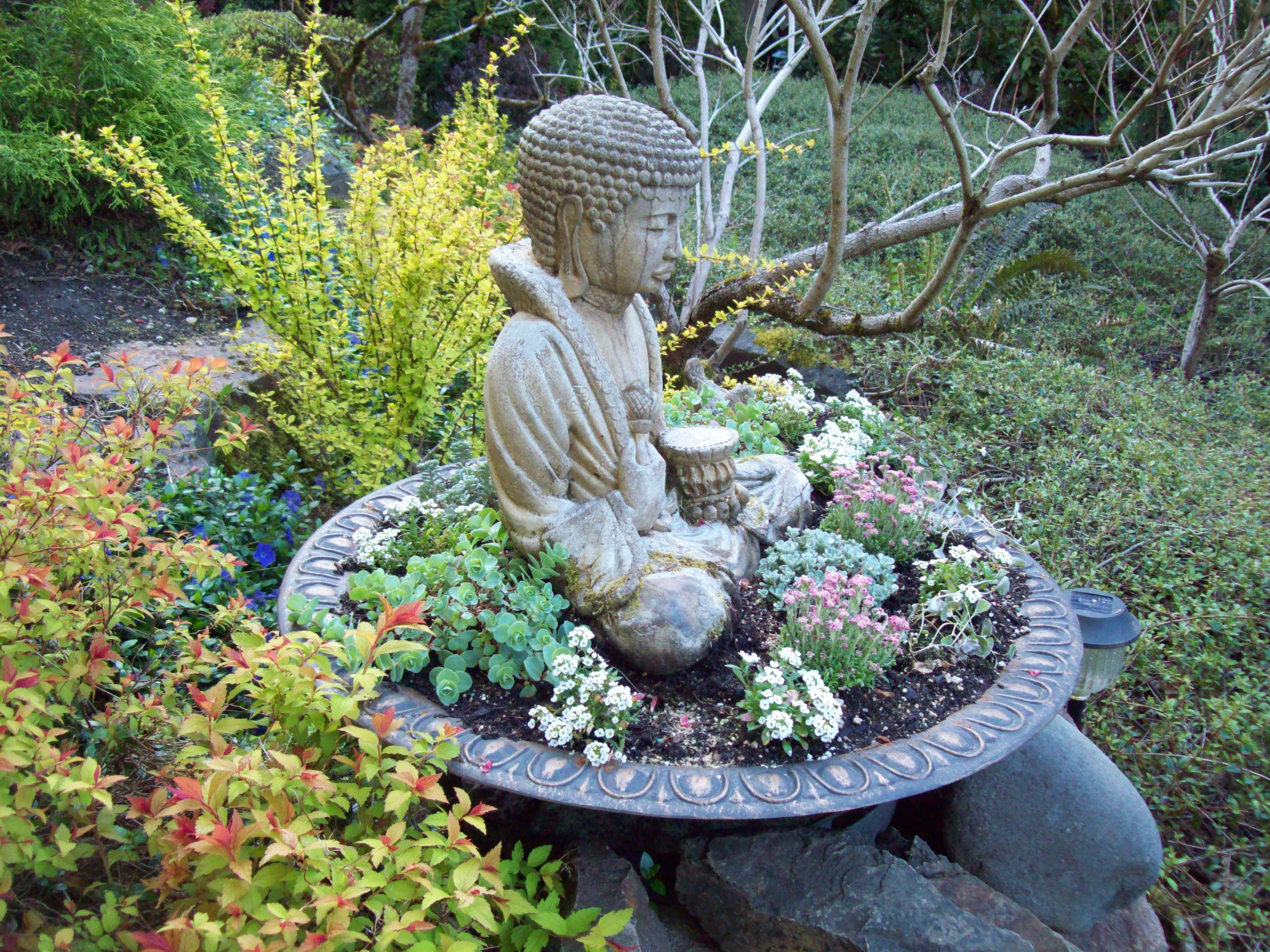 Have a sunny spot and a shallow container? Try planting succulents that show off their silvery foliage, with some accents of white and pink. Here are the plants: bacopa and dichondra ‘silver falls’ for trailing, the stonecrops ‘cape blanco’ and sedum ewersii for succulent foliage, allysum for white, and dwarf pussy toes, antennaria dioica ‘minima’ for pink. Most will remain small and compact and buddha will be pleased with his companions.