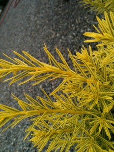 Taxus cuspidata. This plant will turn heads with it’s bright, sunny yellow foliage. The dwarf bright gold yew grows 4-5 feet tall and wide and will lighten up any spot in the garden, including a container. It grows well in sun to partial shade in zones 4-8. Cold winters are okay! This is a low maintenance shrub and is easily shaped with pruning. The fine textured foliage is variegated gold and green, the gold emerging with new spring growth. It pairs well with other dark green conifers, or by a red leaf Japanese Maple. Taxus cuspidata is also known as the Japanese or spreading yew, native to Japan, Korea and Northern China. This yew is more adapted to colder climates than the English yew, Taxus baccata. Like all the yews, bright gold is an evergreen shrub with a slow growth rate (less than 12 inches/year). The fruit matures in late summer and has a red, fleshy covering on the seed, which persists into the fall. I have not seen this plant used very often in landscaping, so it would be a unique addition to our Pacific Northwest gardens.