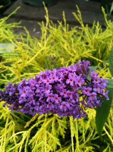 Sometimes being alone is okay, but when you get together with someone else things can get exciting. Try this combination for some shocking color in the garden: Butterfly bush (Buddleia) and Golden Charm False Cypress (Chamaecyparis pisifera filifera).