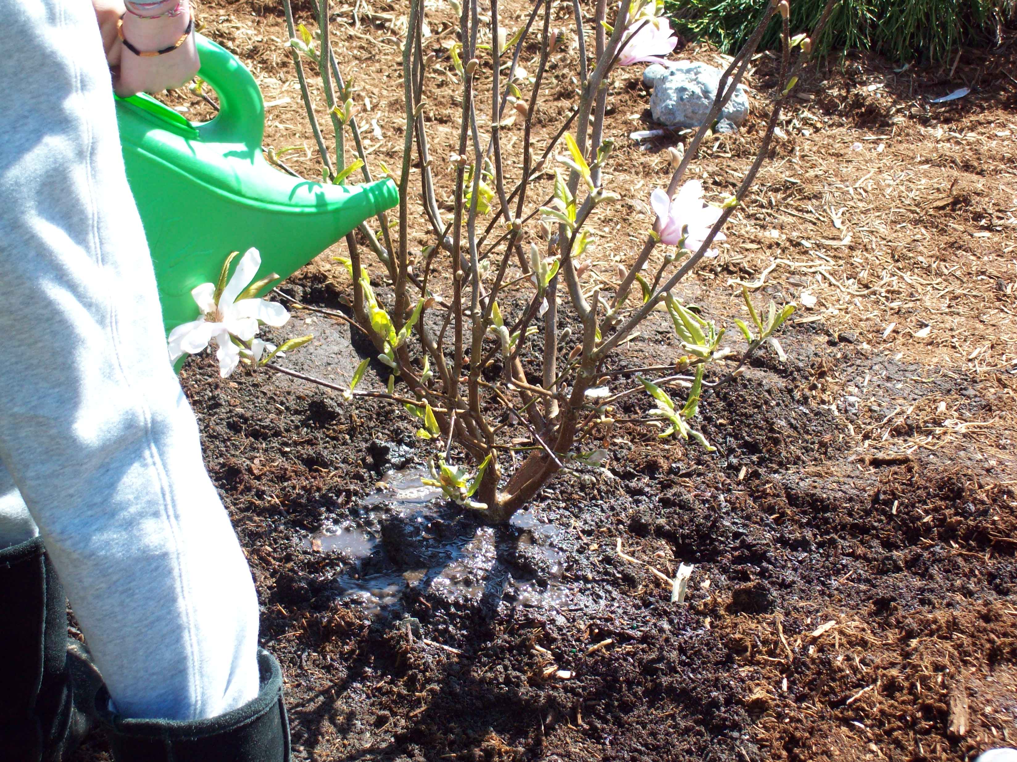 6. Add a three to four inch layer of mulch to help soil retain moisture, suppress weeds and protect from cold in the winter. Keep the mulch a few inches away from base of the trunk. Mulch can be compost, bark, shredded leaves, straw, etc…