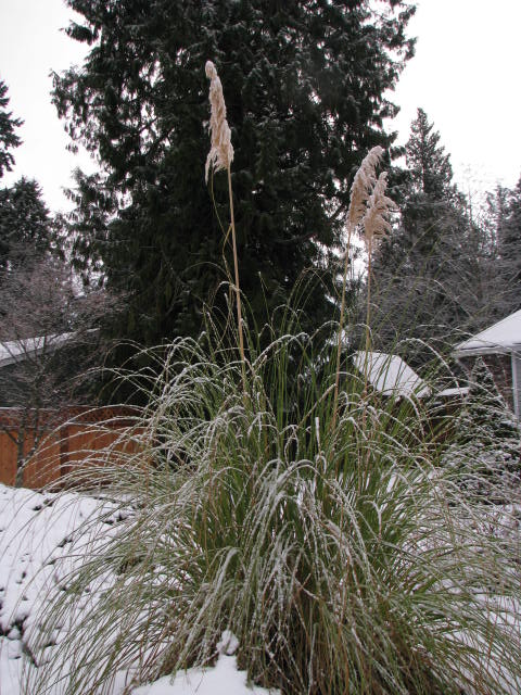 Same plant, different season. These photos were both taken this week. The New Zealand photo simmers of summer. I start to sweat just looking at it. I can feel the waves of heat coming off the plumes, hitting me in the face. The azure blue sky is brilliant and the plumes look like a soft, warm golden sweater. I sure it’s just my size. I’d like to try it on. Right now! On the other side of the world the Pampas grass in Sammamish has a graceful curve. Like a frozen water fountain, it forms a pleasing line as it falls like frozen flakes of snow. I’m actually quite impressed at how good this grass looks in January. It doesn’t have a lot of dead leaves like many I’ve seen. Cortaderia selloana (Pampas grass) can be invasive and difficult to remove in California and the South, but it doesn’t seem to be a problem in Washington. It grows best in full sun in either dry or moist soil and is very fast growing. One characteristic about this plant that sets it apart from most ornamental plants is the sharp edges on the leaves. I’ve simply brushed up against it and started bleeding after the razor-like edge sliced open my skin. A good adaptation if you don’t want to be eaten or moved!