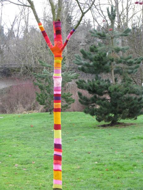 Our city, Sammamish, had four large trees that were cut down at about 20 feet. A few local artists covered them with these ‘tree socks’ and it created quite the controversy. Some loved it, some hated it and finally they were removed and donated to Seattle. I think the tree socks look much better on living trees, those ugly 20 foot stumps were cut down and most people breathed a sigh of relief.