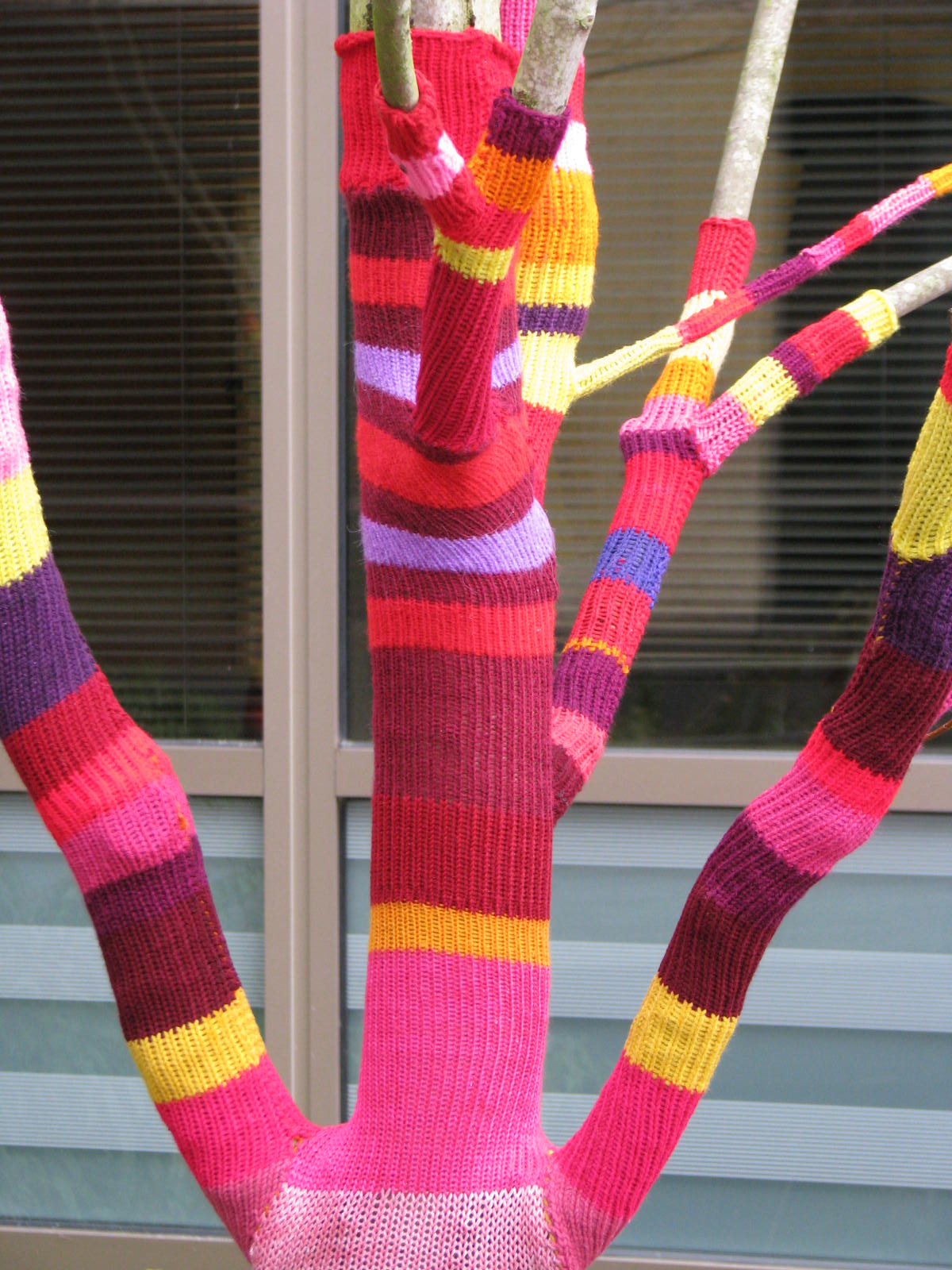 Here in Western Washington we are professionals. We have a rare form of magic horticulture. We can grow anything. With our perfect maritime climate and and lovely sun that’s always shining (above the clouds) anything is possible. We grow trees. And we grow clothes for our trees. Socks and mittens to cover the cold winter wood. It takes a special type of fertilizer. A mixture of blood, sweat and tears. We shake our fists at the sky and cry….where are you sun??? We collapse to the damp earth……we can’t take the darkness anymore. As our tears sink into the soil, something sprouts. It grows in warm, sunny shades. It reaches up and covers the cool, smooth tree trunks. Warming all of us. Giving us a cozy feeling. We wished for the sun and it grew, in Redmond, Washington.