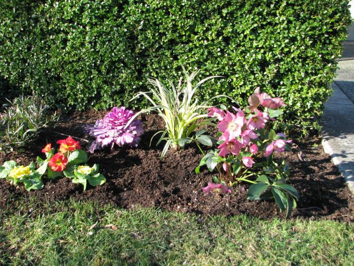 I planted a small area today for a client who needed color in front of her boxwood hedge.  New plants are just starting to arrive at the nurseries, so it’s a good time to refresh a container or just put something new in the ground.   Perennials are preferred, but annuals can be indispensable for color and cost.  I chose ‘Rosemary’ Hellebore for the evergreen, thick leaves and abundance of pink blossoms now.  Next choice was Lirope muscari ‘variegata’ for a bright spot against the dark green hedge.  I  like this evergreen plant for the variegation and the purple flowers which grow on stalks in August-September.  For a pink spring bloomer I love the thick reddish leaves of Bergenia ‘Bressingham Ruby’ (just out of the picture on the left). None of these perennials will disappear for the winter, they all keep their leaves, not afraid to face the frost.  Leftover from Fall is a purple ornamental  cabbage, not yet eaten by the rabbits.  Primroses, planted in groups of three, add a little sparkle, let’s hope the slugs don’t notice them for a while.  I repeated this grouping (minus the hellebore) five times along the hedge to make a bright welcome for the homeowners.