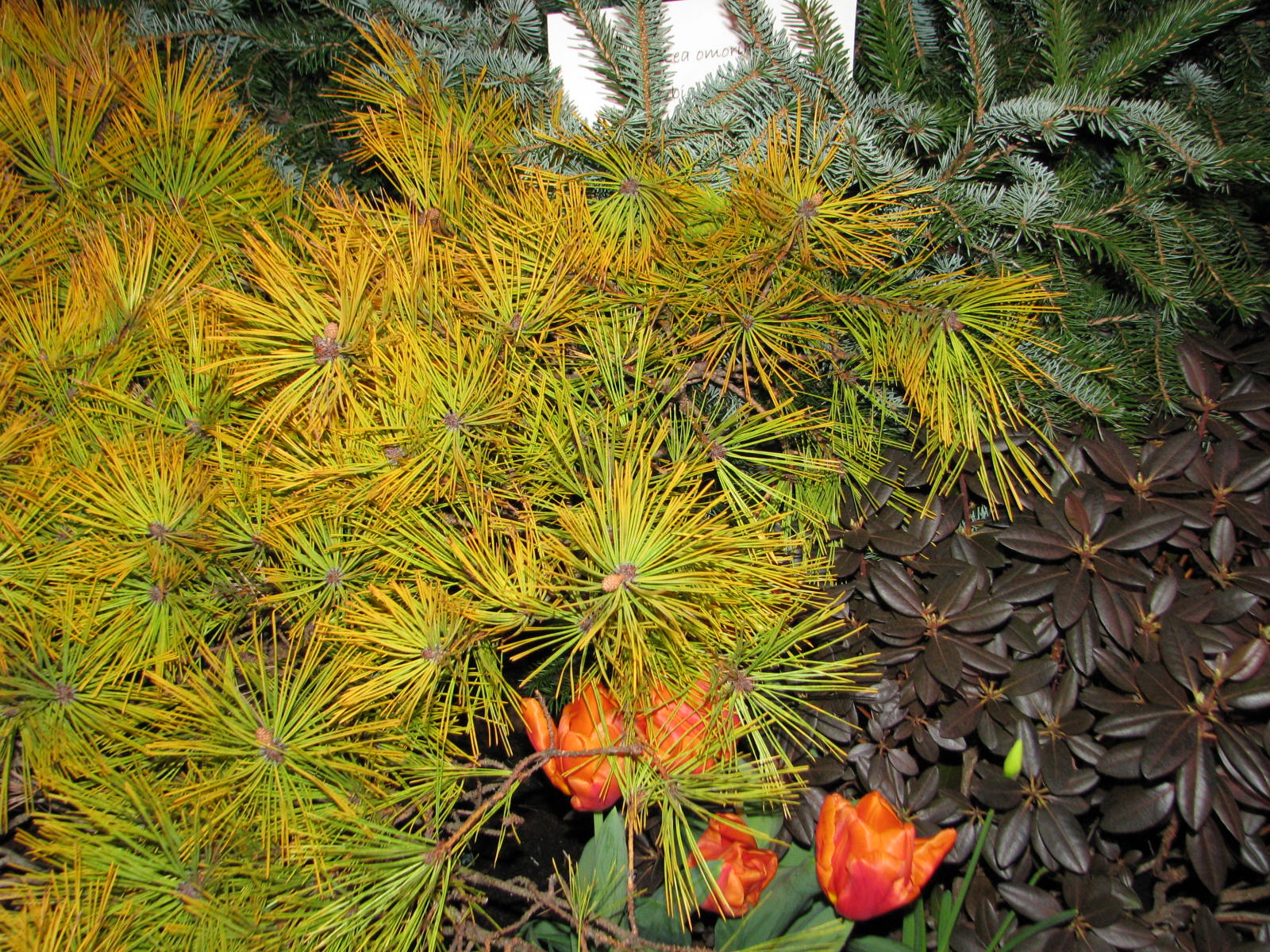 Beautiful foliage on this shrubby pine. There was a little note by it that said ‘Harvest Moon’, but I can’t find it, still looking. It contrasts well with the PJM rhododendron on the right.