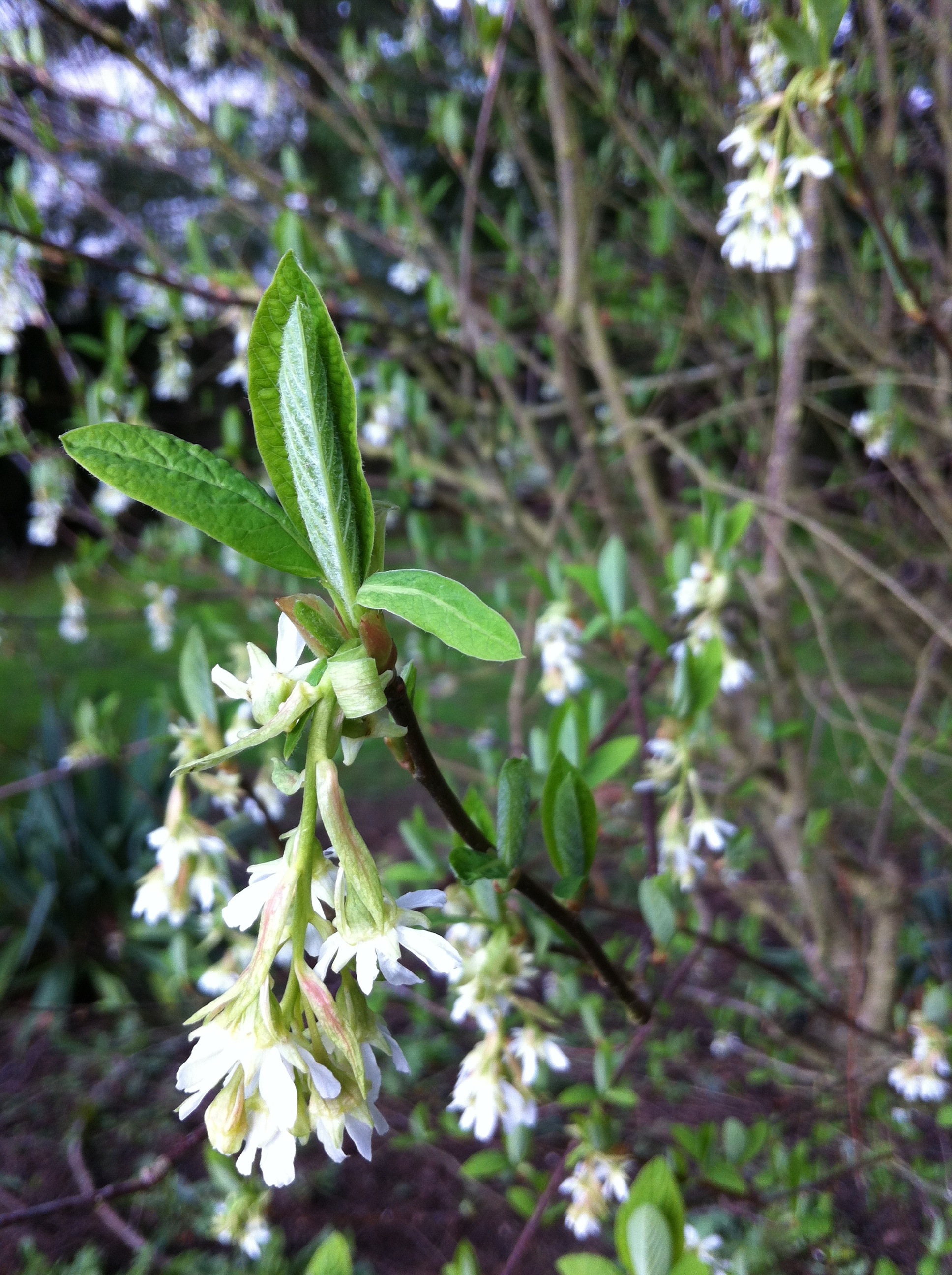 This delicate native shrub is hard to miss right now in mid-March. It’s a funny little chameleon. Most of the year it’s standard green, blending in and camouflaging with other Northwest native plants. But suddenly in March the small, trembling white flowers seem to be suspended on all the branches. Soft and white they peek out of the brown, bare woods, the bright green leaves just emerging on Indian Plum, or Oso Berry. When I first heard of this plant it was mid-summer and I was excited to find a native ‘plum’. Something we could eat and harvest! I had visions of picking the juicy fruit, and feasting, rather like we do on the sweet wild blackberry. I grabbed my girls and a bucket for collecting and off we trekked, in search of this new wild harvest. We had a greenbelt in our neighborhood and located a few Oemleria cerasiformis within a mile of our house. We were so excited to pick the ‘plums’, to try a tasty new fruit and maybe even make jam! To our surprise, the fruit was rather small, more like a large olive, than a plum. To our further surprise…. yuck! They did not taste good. These plums were sour and hardly palatable. We quickly changed our attitude from eager to try the first bite, to daring each other just to take a bite. It went into the pool of survival food. Something to remember when we were really, really, hungry and stranded in the woods. Maybe we could make jam, but only with lots of sugar and a few cups of berries as well.