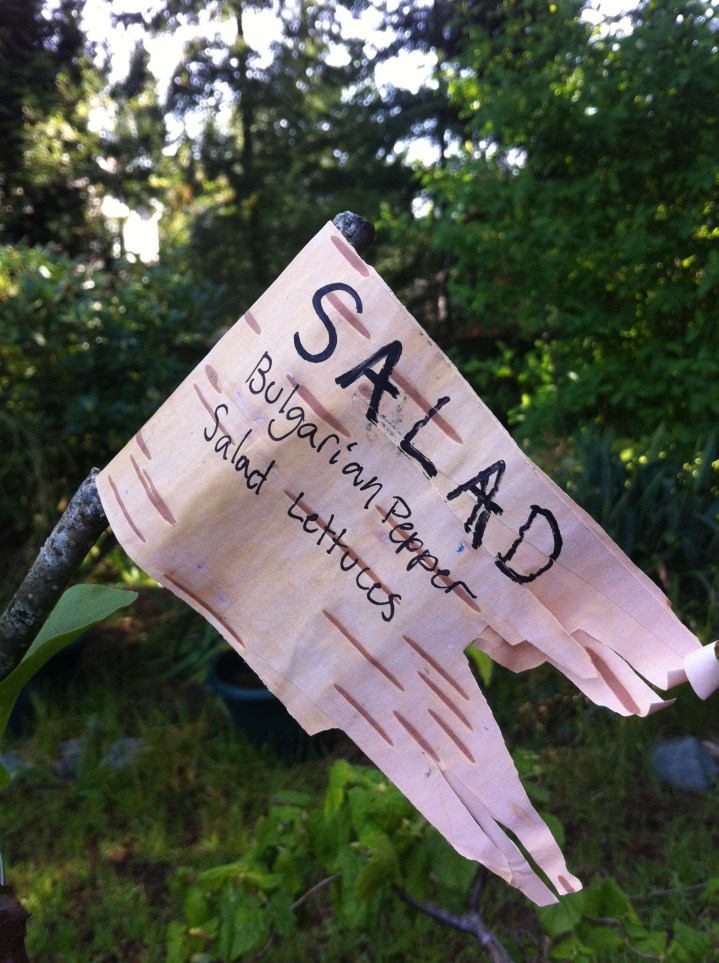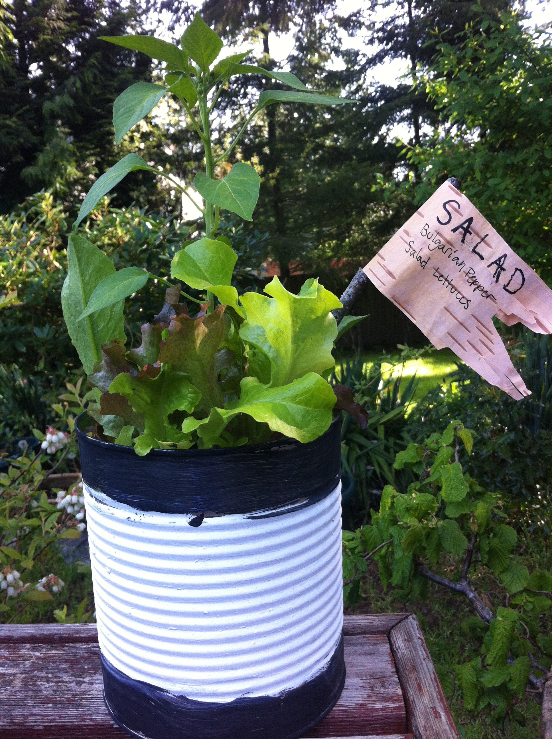 Take those leftover cans and turn them into a garden! For this activity all that is needed is a can, a little paint, a few vegetable starts and some creativity. For plant markers we made birch bark flags and wrote the names on them with a permanent marker. Add sun, water and soil and little gardeners can grow their own food!