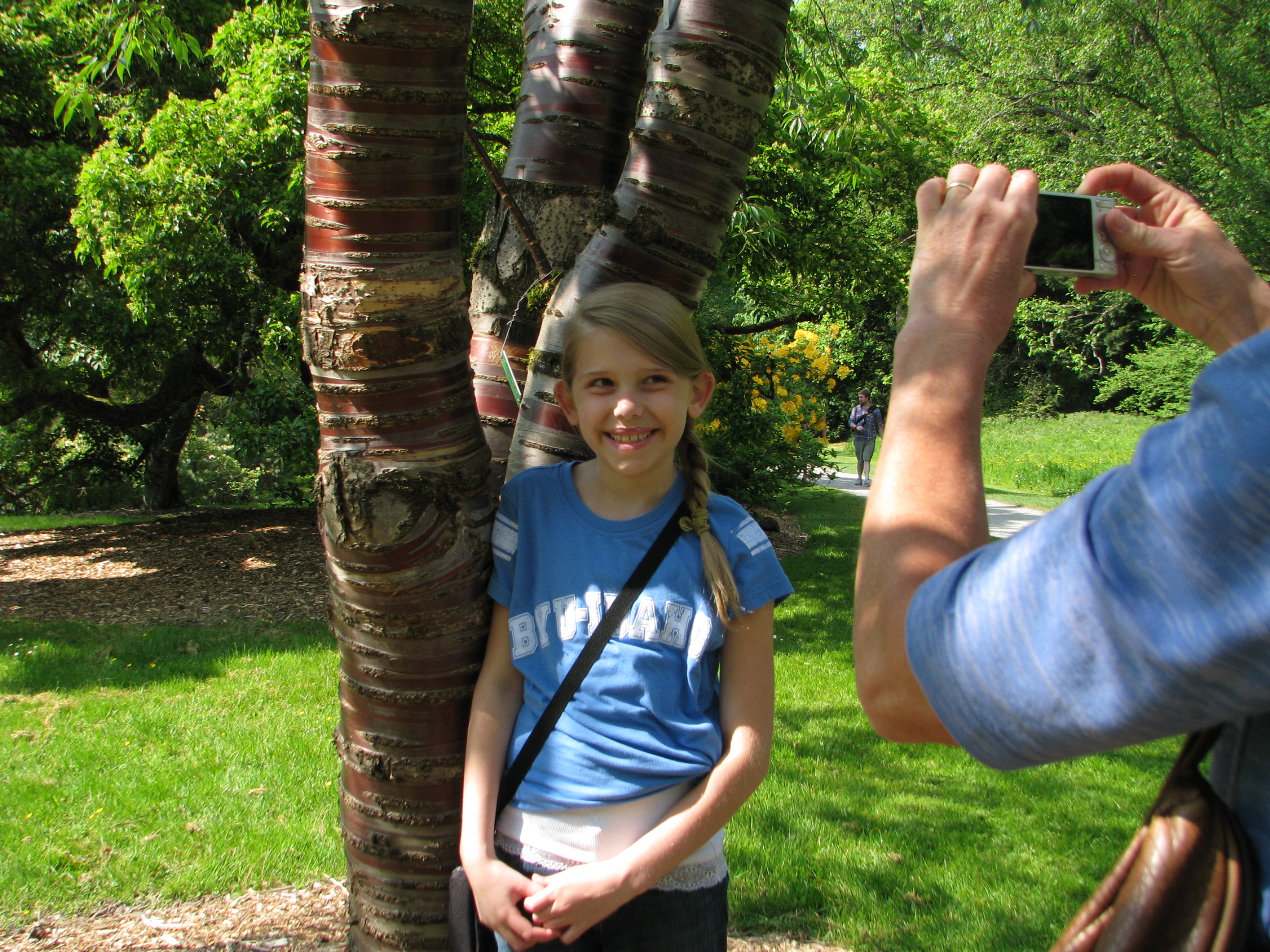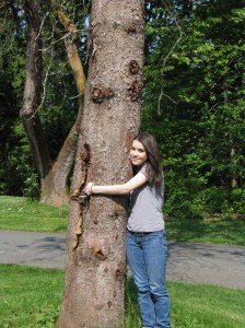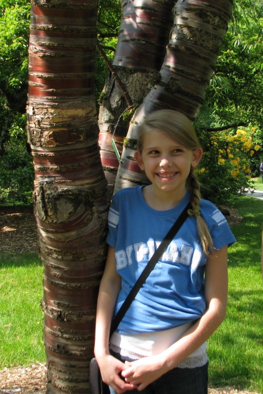 Everyone needs a tree to call their own.  Trees are all around us, but have you ever picked a favorite?  One special tree to watch through the seasons.  To photograph and spy on?  It’s like posing with a member of the family.  A tall member, with really good hair.  Trees are fun.  We walk among them and find shade under their branches.   We hug them and gaze into their leaves.  We climb into their branches and swing from their limbs.  On our walk around the arboretum my girls and I each picked out our trees.  We decided to take a photo with them each time we visit.  And the winners are…