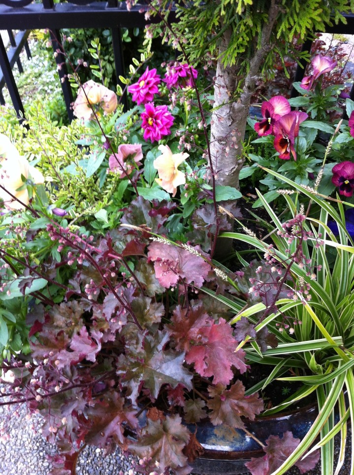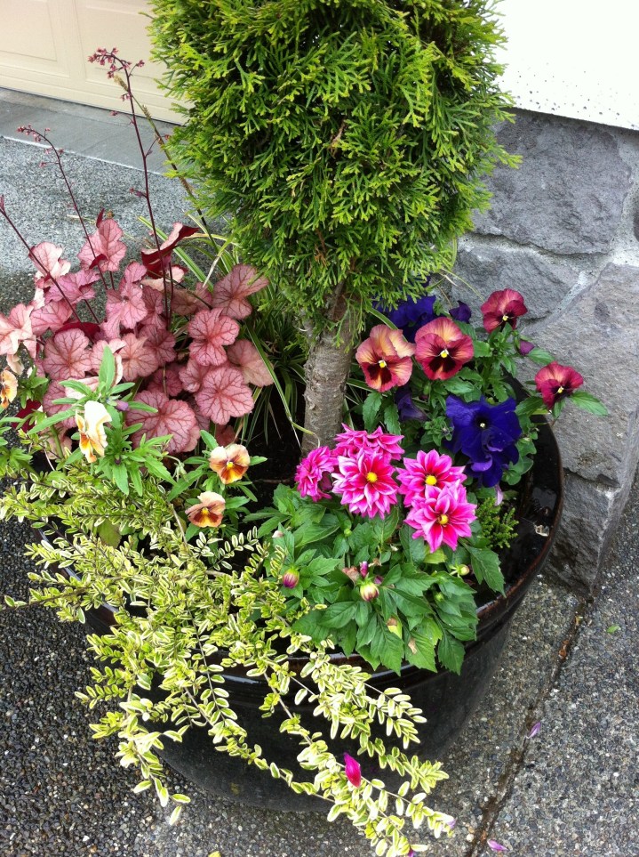 I planted these containers for a client last fall. The topiary arborvitae was in place, but she wanted color for the winter (we are so lucky to live in the Pacific Northwest where we can have color in the winter!). I added heuchera, a variegated carex sedge, a small heather, variegated lonicera (bush honeysuckle), pansies and chrysanthemums. The mums didn’t make it beyond a few weeks, but everything else sailed through the winter, passed merrily into spring and is overjoyed that summer is almost here! The pansies just won’t quit blooming, the heuchera has filled out, the lonicera continues to grow over the edge and I keep telling these two pots ‘you were supposed to be seasonal! I was going to add spring color, summer sun (we did put in a few dahlias and petunias) or perhaps more perennials. But instead of fading, you just kept getting better….more color, more texture, more flowers from those crazy pansies!’ I did fertilize with Alaska Fish Fertilizer once or twice a month and here are the results: