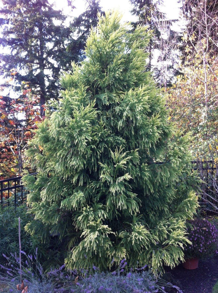 If you saw this scrawny little Japanese Cedar at the nursery, you probably wouldn’t look again.  It’s top-heavy, oddly shaped and strange.  Not the perfectly symmetrical conifer that most people are looking for.  But if you waited a few years you would be in for a real treat, for this ugly duckling will  transform into a swan!  A graceful and full Japanese Cedar with a beautiful dusting of brightness on the tips that is makes it a magnificent focal point in the garden.  The first time I saw the tree pictured below I was immediately drawn to it.  I ran my hand over the course foliage, I admired the knobby cones scattered throughout the tree and I just had to stop and stare at the colors that seemed to rain down upon the tree.  A creamy white was dripping off all the branches.  So pretty!  Once I learned the name of this Japanese Cedar, Cryptomeria japonica Sekkan Sugi, I began to learn more about it and to look for it in the landscape.  Alas, this variety is not as common as a Emerald Green Arborvitae or Leyland Cypress, but it does show off it’s royal branches in the occasional yard.