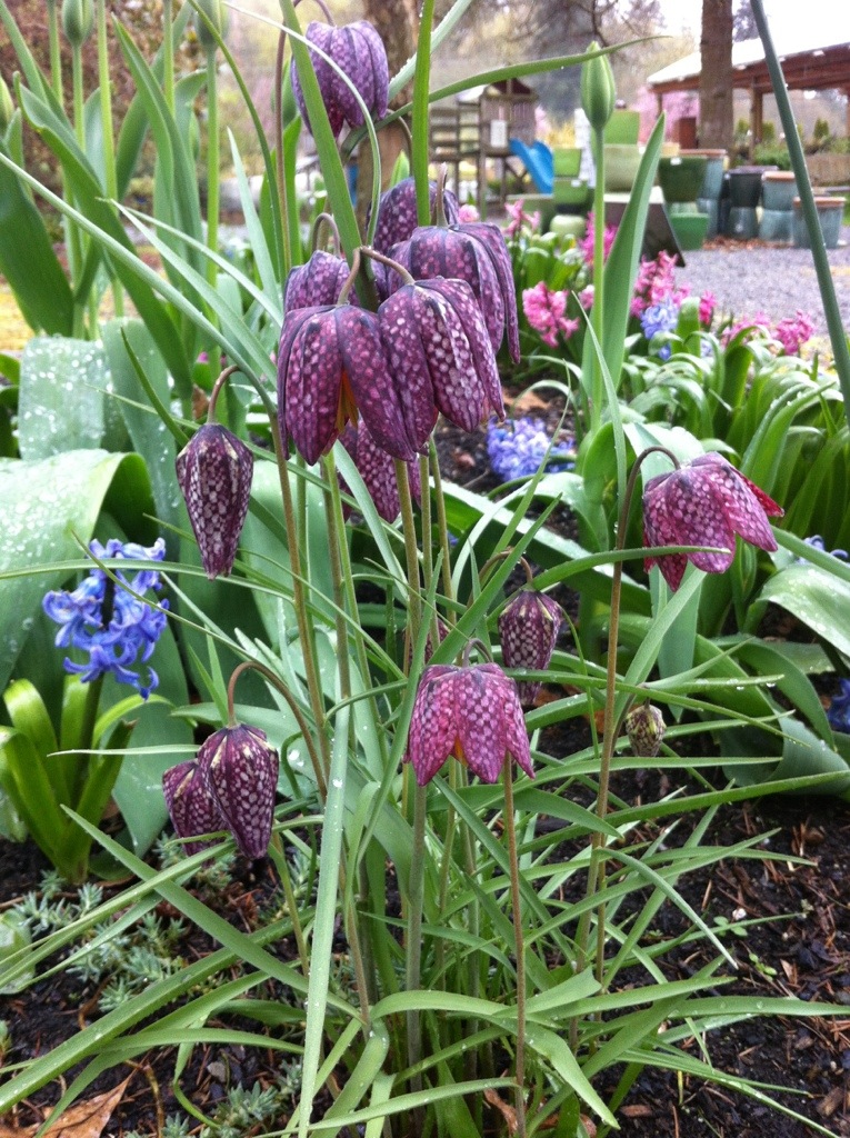 Fritillaria or the checkered lily doesn’t seem very plant-like. It hasn’t the natural swirls and twirls of many things organic, but rather a geometric pattern, like someone has placed a stencil over the petals and shaded in those little squares. Squares??? Where else in the botanical world do we see squares? There are lots of dots and spots, splashes and dashes, solids and stripes, but I can’t think of another square. Please comment if you know of one! This intriguing flower blooms in the spring from a bulb and forms a nice clump over time, as seen in the photo above. Our native fritillarias are also known as rice root. The Native Americans ate the bulblets steamed. They were said to be tender and delicate, resembling rice and having a slightly bitter after taste. (Plants of the Pacific Northwest by Pojar and MacKinnon)