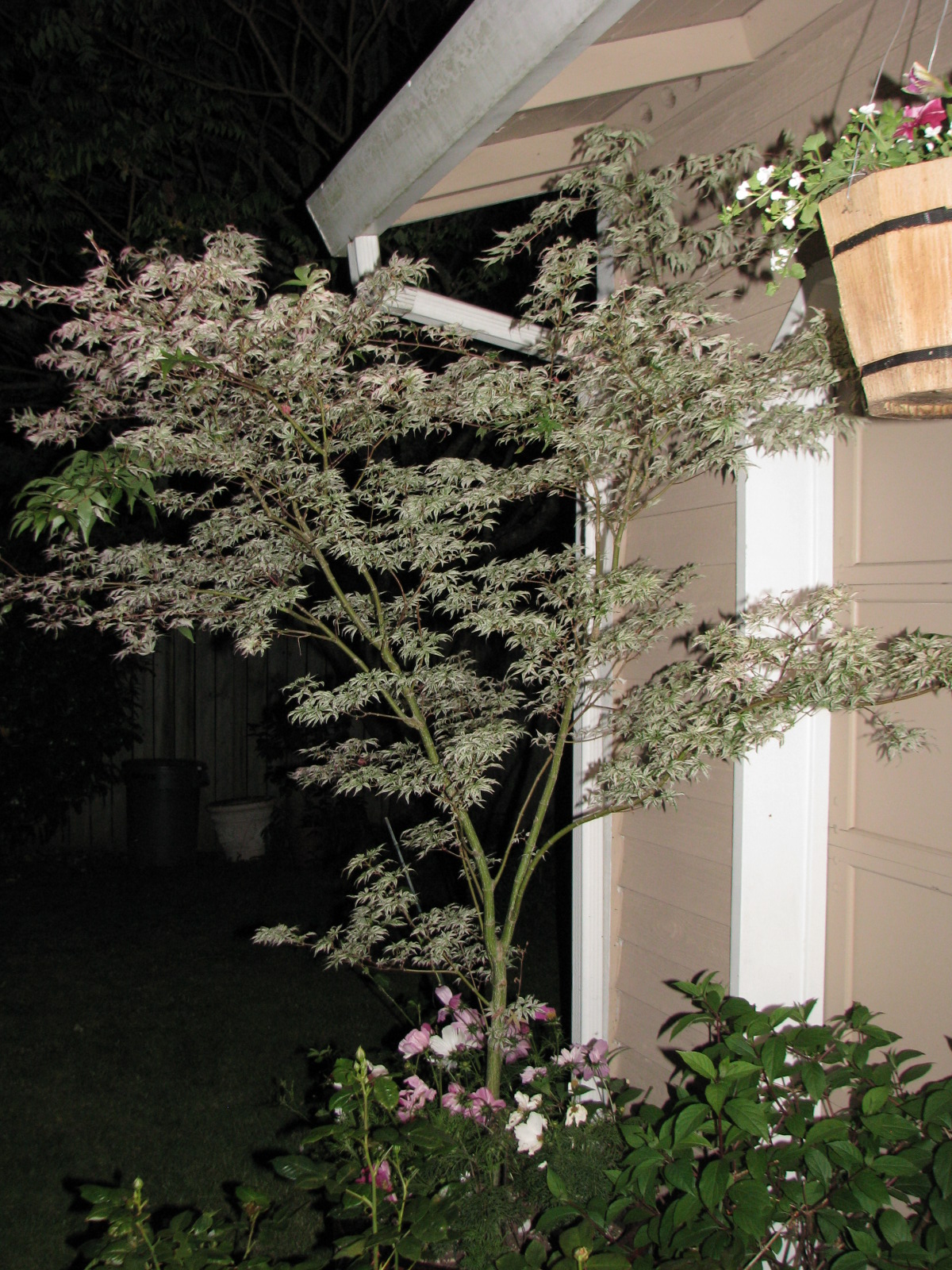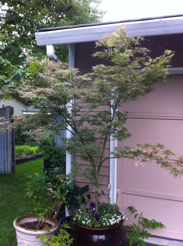 Here is my Ukigumo Japanese Maple as it travels through time. This beautiful Acer palmatum has been with me for five years and it’s grown a lot. This years photo shows it weighted down with raindrops and with partial variegation. I recently read that variegation is influenced by cultural conditions and that the leaves will revert to plain green with too much fertilizer or too much sun. I love all the colors on my Ukigumo, which receives full afternoon sun. Sometimes it gets a little burned on hot summer days, but I like it where it is, welcoming me home.