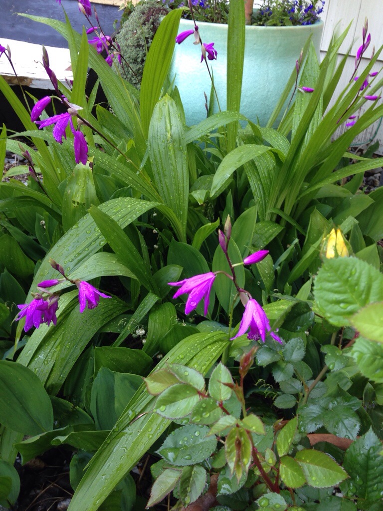 I like this plant, Bletilla striata. When we moved into a new house this winter I saw a patch of dead leaves and wondered, what is that??? They were long with parallel veins and I thought, maybe Crocosmia? In the early spring some green started to peek out and flower buds formed. It soon became apparent that the new growth was Lily of the Valley, you can see the remnants of their flowers in the pictures below. But I knew that the dead leaves I had seen were much longer than Lily of the Valley, so I was quite puzzled until I saw another set of leaves poking up through the Lily of the Valley. Here comes that mystery plant I said to myself. It was such a delightful surprise to see the rich purple blossoms of the hardy ground orchid opening up. I have an orchid in my garden! Bletila striata is right outside my back door! I feel like I’ve reached a new level. First I earned enough points to have a garden with just pansies and petunias. Then after putting in the required time I reached the level of roses and Japanese Maples. Now, after hours of searching and jumping and solving (yes, I’m thinking Mario World) I made it o the Orchid level! Okay, I actually cheated at this game by taking a time warp tunnel to this level, because I didn’t plant it myself…it just appeared! Regardless of how I arrived, I am really happy to be at this level and I wonder, what’s next???