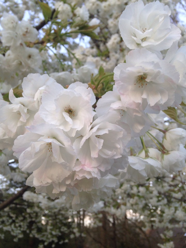 The double pure white blossoms of the Mount Fuji flowering cherry opened last month and I knew that was my favorite tree.  It called to me on my walks and I kept getting drawn to it.  My dog tried to get me over where the grass smelled like several shades of pee, but I couldn’t take my eyes off of this tree.  Petals so white, so light, they seemed to be made of some other-worldly matter that drifted down from the stars.  The buds, slightly pink, opened to a clear true indescribable white.  Well, let me try to describe.  It’s definitely not just plain old white.  It’s not snow white, or paper white or milk white, but maybe moon or star white.  At a glance it appears a light joyful, carefree white, but upon inspection, it’s alive with colors. So many colors of the rainbow are swirling around those blossoms that they all crash into each other and explode into white. Light, bright, shining spring white.  When I stand under that tree, gazing up at thousands of soft petals, the future and the past become irrelevant. There is only the here and now.  It’s as if that Mount Fuji flowering cherry has the power to pull me into the present like no other life form.  I am here, surrounded by color, and all I see is white full of light.  But then the dog insists on pulling me over to the next clump of sweet-smelling grass and it’s back to the future.  Hey, is that a Kwanzan Flowering Cherry?  Those petals are so pink, like nothing I’ve ever seen before…