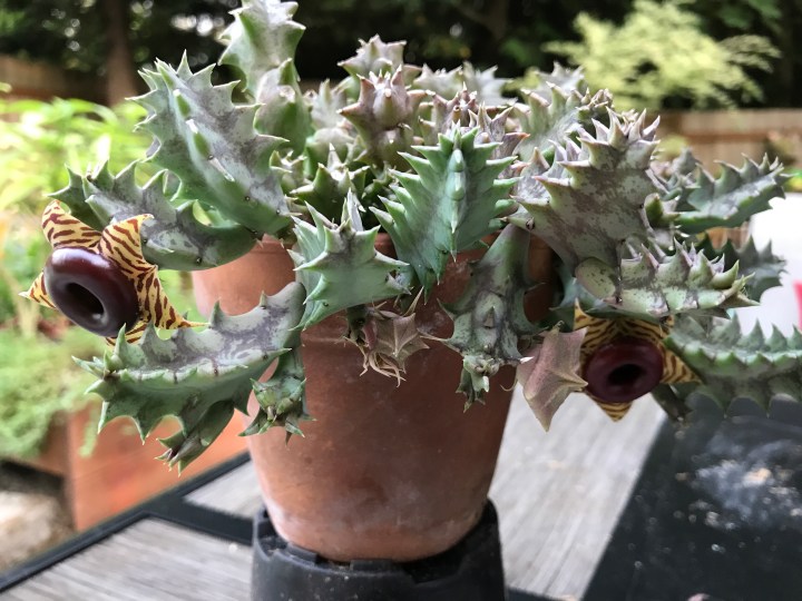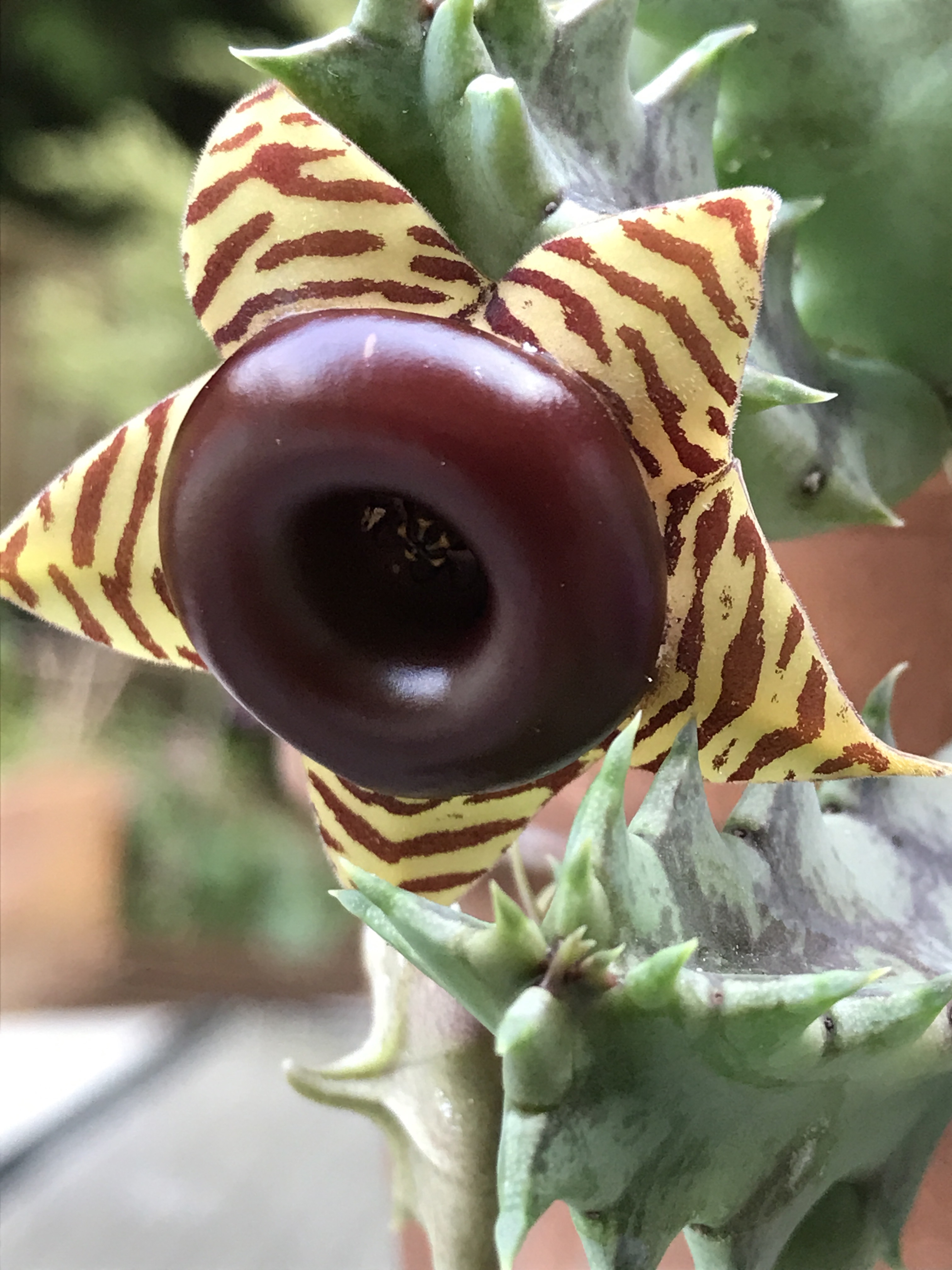 img_1186Huernia zebrina is the lifesaver plant. The plant that inspired me to start writing after a distracted break from blogging.  When something comes into my life, something usually has to go out and unfortunately my dear rainyleaf was the victim when I began teaching early morning seminary to the youth of my church. But it’s still summer and I’m ready reacquaint myself with WordPress once again. I’m more than ready, I’m excited to talk about plants!  I received this tender succulent from Sandy, the owner of Sunshine Enterprises, a wholesale nursery in the state of Washington. She grows herbs, geraniums, succulents and lots of other cool stuff.  At first glance this plant is cactus-like. Small, green and prickly.  Bumpy and spreading, it doesn’t have much to recommend it until summer arrives and this fantastic flower arrives.  It looks and feels just like a gummy lifesaver.  It’s incredible! This plant is a tender succulent and I brought it inside last winter. It appears to overwinter outside in zones 9 and above. It is easy to propagate from stem cuttings.  A piece of mine broke off and has easily rooted just sitting on top of the soil.  Perhaps it’s the color, but this flower seems very un-plant-like.  Maybe it’s the shape.  Who has ever seen anything like this outside of a roll of lifesaver candies? I’m looking forward to wathcing mine grow and producing more delicious flowers each year. Once sources says that Huernia is in the same family as Euphorbia, making it poisonous, so don’t eat it. But it’s definitely worth growing just for its funky flower.