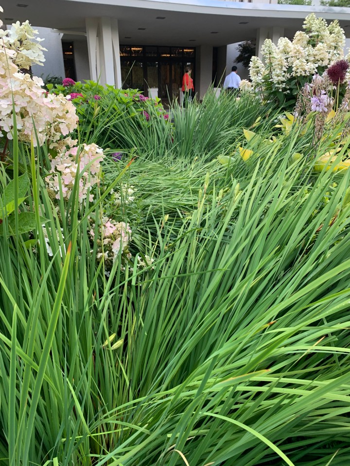 The iris clumps had grown so big over time that after blooming they flopped and fell onto the ground, especially after a rain. I cut off a lot of leaves from the perimeter of the clumps and then tied the lower third to help them stand up. It probably will be beneficial to divide these enormous clumps in the Fall so they don’t get so heavy with foliage.