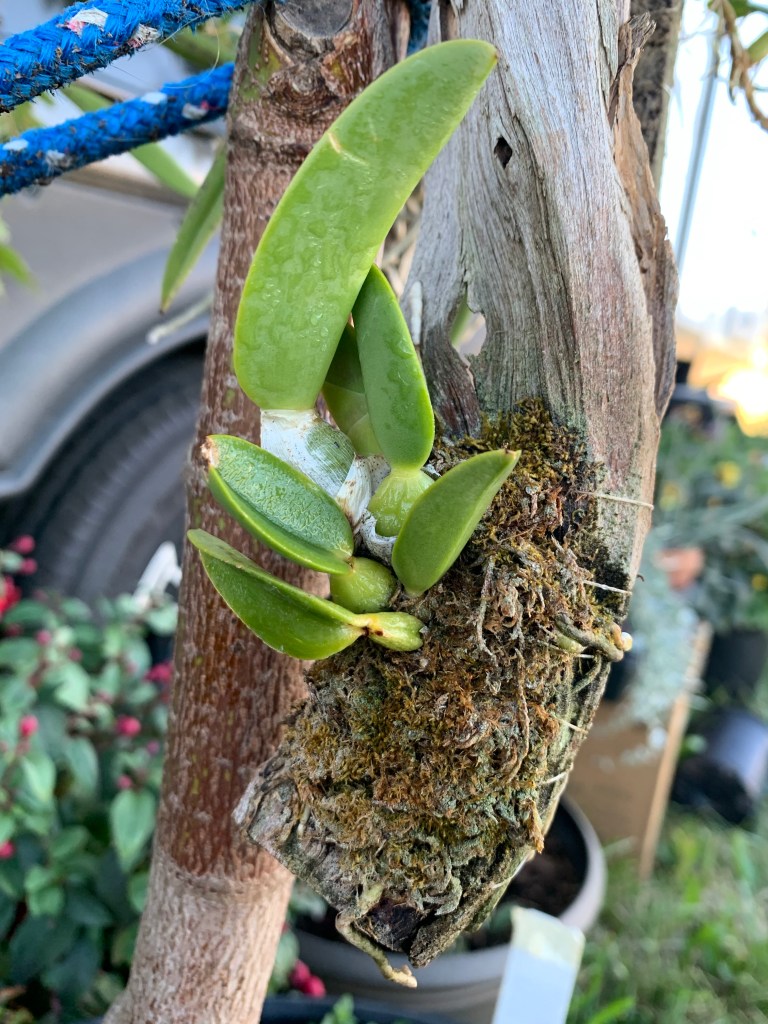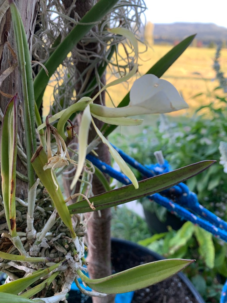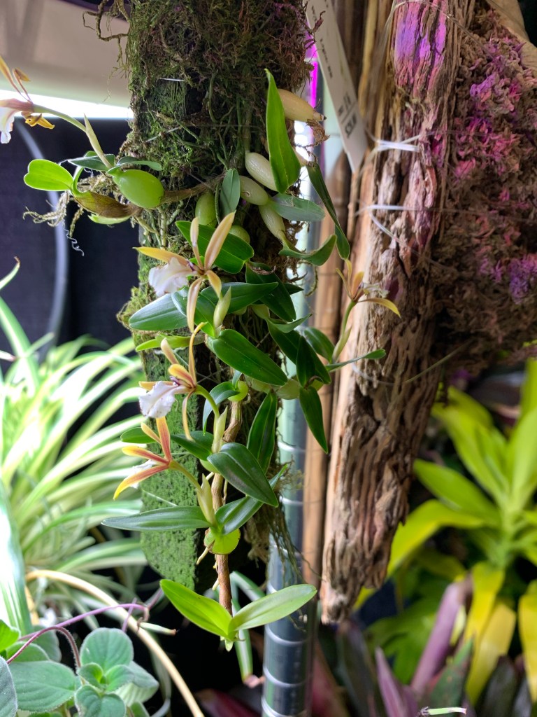 Vanilla pleniflora I have in a pot. It actually seems to like the heat, I’m trying to keep it well watered. We had some temps in the 30’s in May and the tips died back. Masdevallia amabilis also in a small pot. It’s been inside our trailer by a window. I keep it moist in a small jar and it looks good! Pleurothallis I have two and they are both struggling. So much so that I transferred them to my mom’s house in Utah to try and revive. I had them inside and they started to drop leaves. It was hard to give them the right amount of light and keep them evenly moist. One of these is my very first orchid and I’ve already revived it several times over the years. I hope it can fight back to health.